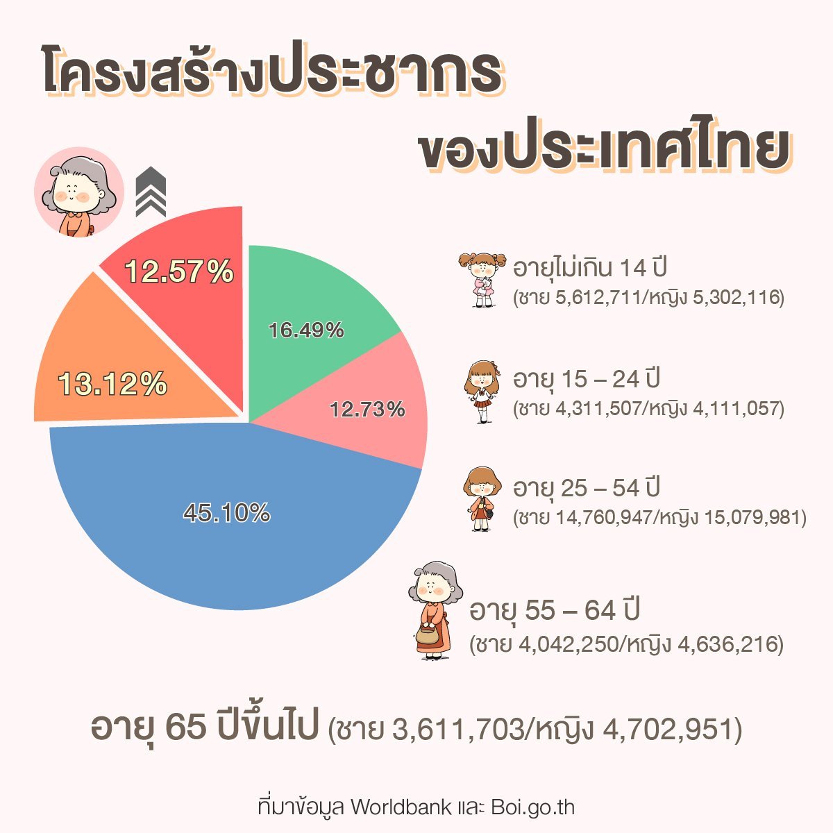 สำหรับประเทศไทย มีประชากรสูงวัยอายุ 65 ปีขึ้นไป จำนวน 8,314,654 คน คิดเป็นสัดส่วนสูงถึง 12.57% จากประชากรทั้งหมด 66.17 ล้านคน ตามมาด้วยช่วงอายุ 55-64 ปี วัยกำลังเกษียณ มีจำนวน 8,678,466 คน ซึ่งมีการคาดการณ์ไว้ว่า สัดส่วนของผู้สูงอายุจะเพิ่มขึ้นไปถึงร้อยละ 20-30 เปอร์เซ็นต์ในอนาคต แสดงว่าประชากร ทุกๆ 100 คน เราจะพบจำนวนผู้สูงอายุมากถึง 30 คนเลยทีเดียว