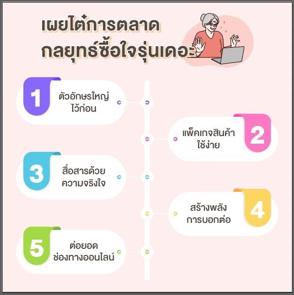 ปิดท้ายด้วยเทคนิคการตลาด สำหรับคนที่อยากเจาะกลุ่มผู้บริโภคสูงวัยเหล่านี้ให้อยู่หมัด ว่าควรทำอย่างไร จึงจะสื่อสารได้มีประสิทธิภาพและตรงจุดมากที่สุด