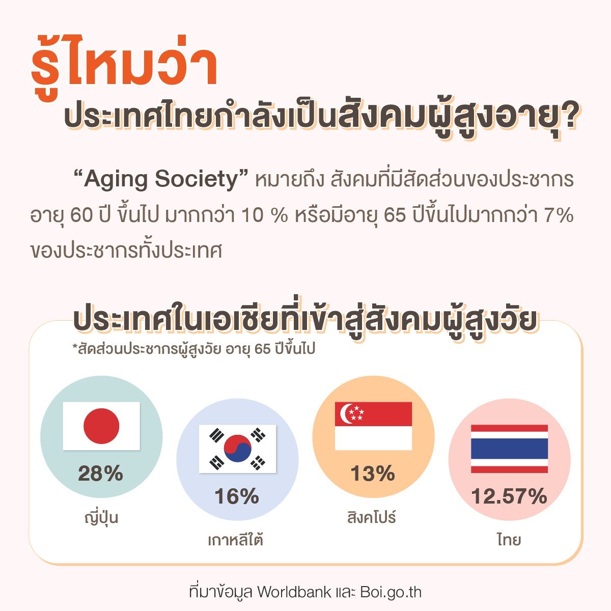 จะเห็นว่า Aging Society จะกลายเป็นส่วนหนึ่งของสังคมไทย ที่อยู่กับเราทุกคนไปอีกนานตราบใดที่โครงสร้างประชากรยังไม่เปลี่ยนแปลง ดังนั้นการทำธุรกิจที่เกี่ยวข้องกับ Aging Society ไม่ว่าจะเป็น การท่องเที่ยว Wellness Tourism , อาหารเพื่อสุขภาพ หรือแม้แต่การสร้างแบรนด์ผลิตภัณฑ์สำหรับผู้สูงวัย ก็ล้วนเป็นโอกาสที่มีแนวโน้มเติบโตสดใสในอนาคตอย่างแน่นอน