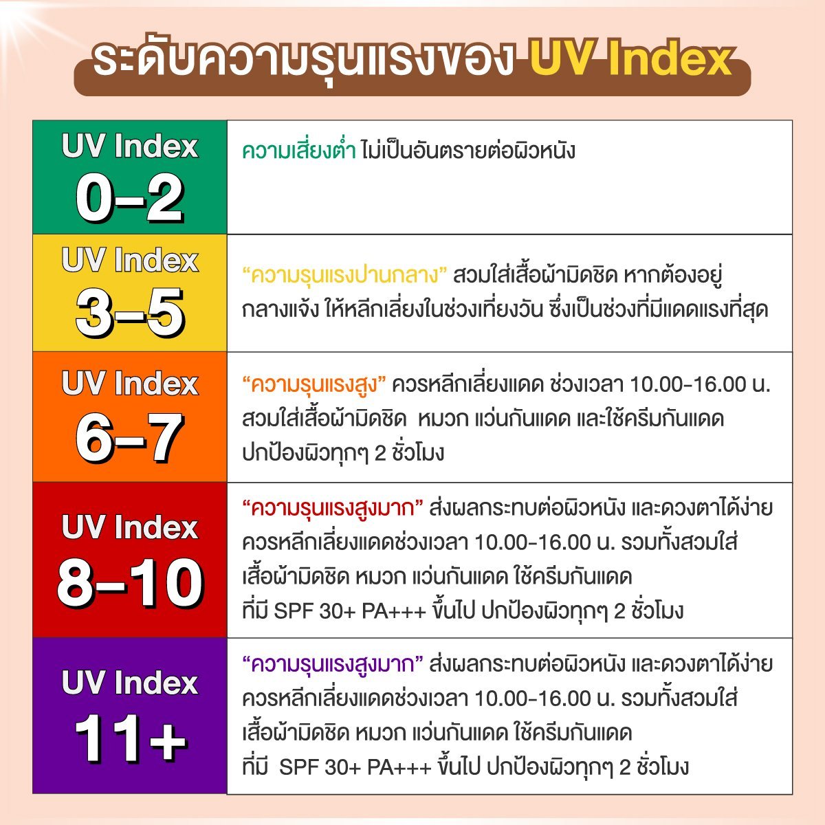 จะเห็นว่า ยิ่งค่า UV Index สูง ยิ่งเป็นอันตรายต่อผิวได้ง่าย ถ้าหากไม่ปกป้องผิวให้เพียงพอ ก็อาจเผชิญปัญหาผิวไหม้แดด สีผิวหมองคล้ำ ผิวแลดูแก่กว่าวัย รวมไปถึงโรคมะเร็งผิวหนังได้อีกด้วย ซึ่งข้อมูลจากกรมอุตุนิยมวิทยา พบว่าแดดในเมืองไทย มีค่าเฉลี่ย UV Index อยู่ที่ 11 12 และในบางพื้นที่ อาจมีค่า UV Index สูงถึง 13+ ซึ่งถือว่าเป็นระดับที่สูงมากๆ