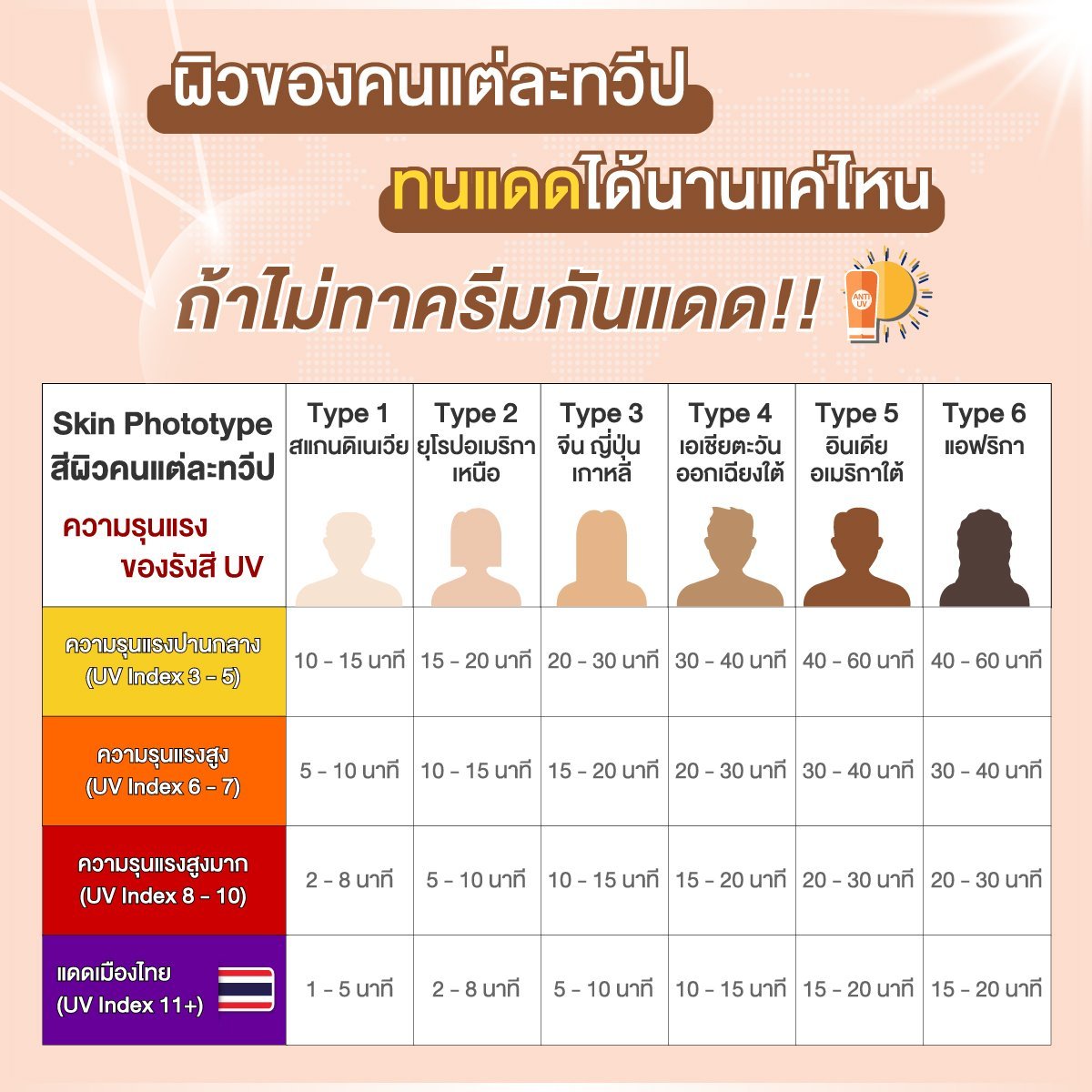 จากตารางข้างต้น คนอินเดีย อเมริกาใต้ และทวีปแอฟริกา ซึ่งเป็น Skin Phototype 5 และ 6 ที่มีผิวสีเข้ม สามารถทนแดดได้นานกว่าสีผิวอื่นๆทั้งหมด ในขณะที่คนผิวขาวโซนสแกนดิเนเวีย Skin Phototype 1 เกิดอาการผิวไหม้แดดได้ง่ายที่สุด