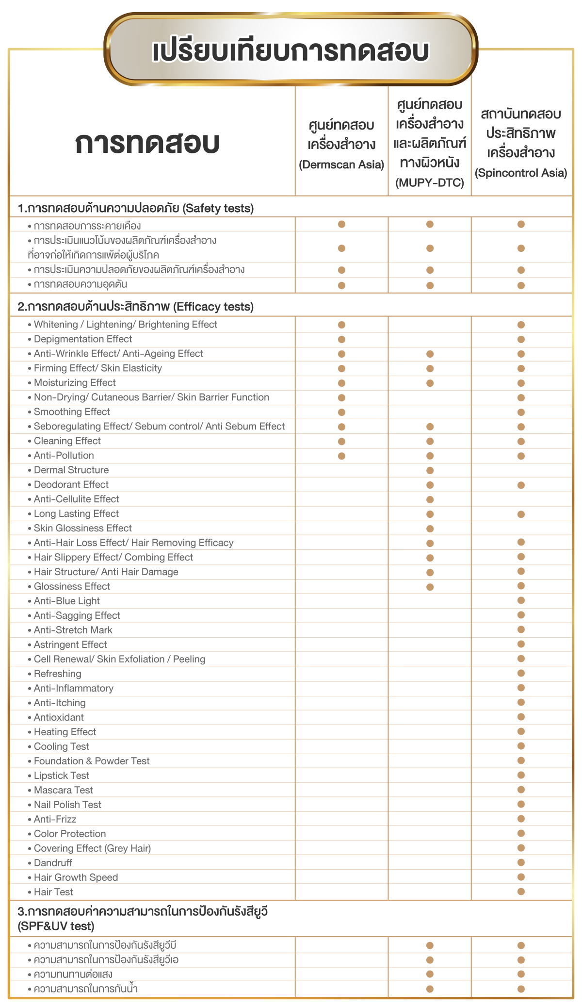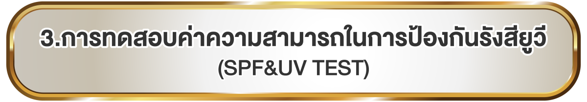 การทดสอบประสิทธิภาพของเครื่องสำอางที่มีส่วนผสมของสารกันแดด ตามมาตรฐาน ISO 24444 ซึ่งเป็นมาตรฐานสากลที่ทั่วโลกให้การยอมรับ โดยผลการทดสอบจะแสดงค่า SPF ตั้งแต่ SPF6 จนถึง SPF50+ และ PA ตั้งแต่ + จนถึง ++++ ตามจริงของผลิตภัณฑ์นั้นๆ ว่ามีเท่าไหร่ จะได้รับเอกสารยืนยันผลลัพธ์ยืนยันจากทาง Lab ทดสอบสร้างความน่าเชื่อถือให้แบรนด์ และสร้างความมั่นใจให้ผู้บริโภคในการใช้ผลิตภัณฑ์