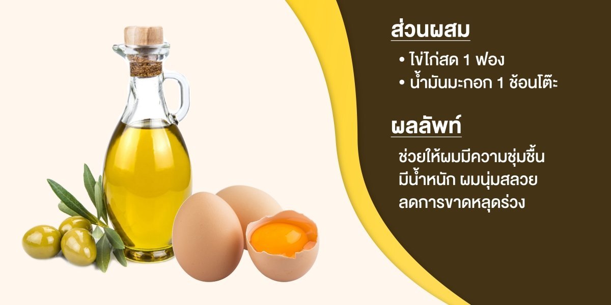 ไข่แดงเป็นสารบำรุงผมจากธรรมชาติที่ดีที่สุดสำหรับเส้นผมเพราะอุดมไปด้วยวิตามิน เอ และ เปปไทด์ที่ช่วยในการเจริญเติบโตของเส้นผมและช่วยเพิ่มความสามารถในการให้ความชุ่มชื้นแก่เส้นผมอีกด้วย น้ำมันมะกอกเองก็มีประโยชน์ต่อเส้นผมนานับประการเช่นกัน อาทิ ลดกระบวนการสร้าง DHT (ฮอร์โมนเพศชายที่ทำให้หัวล้าน) ป้องกันผมจากการแห้งเสีย ช่วยให้ผมนุ่มสลวยมีน้ำหนัก เป็นต้น