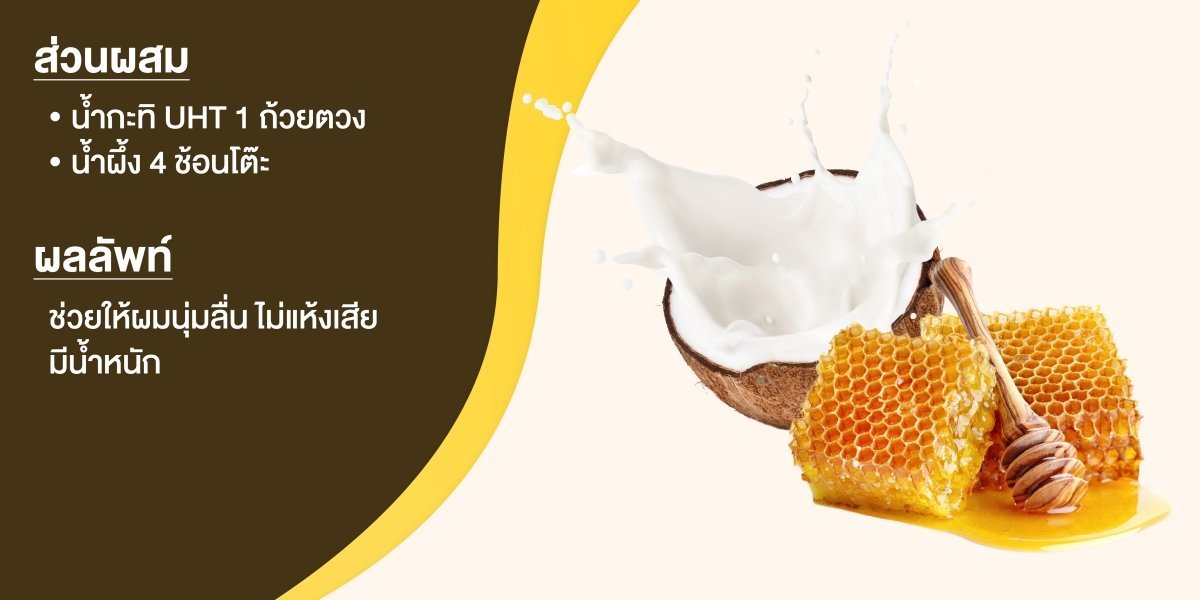 กะทิมีส่วนช่วยฟื้นฟูเส้นผมที่แห้งเสียให้มีความยืดหยุ่น ชุ่มชื้น มีน้ำหนัก ส่วนน้ำผึ้งเองก็เป็นสารมอยส์เจอร์ไรเซอร์จากธรรมชาติ ช่วยบำรุงให้ผมนุ่ม ชุ่มชื้น สุขภาพดี