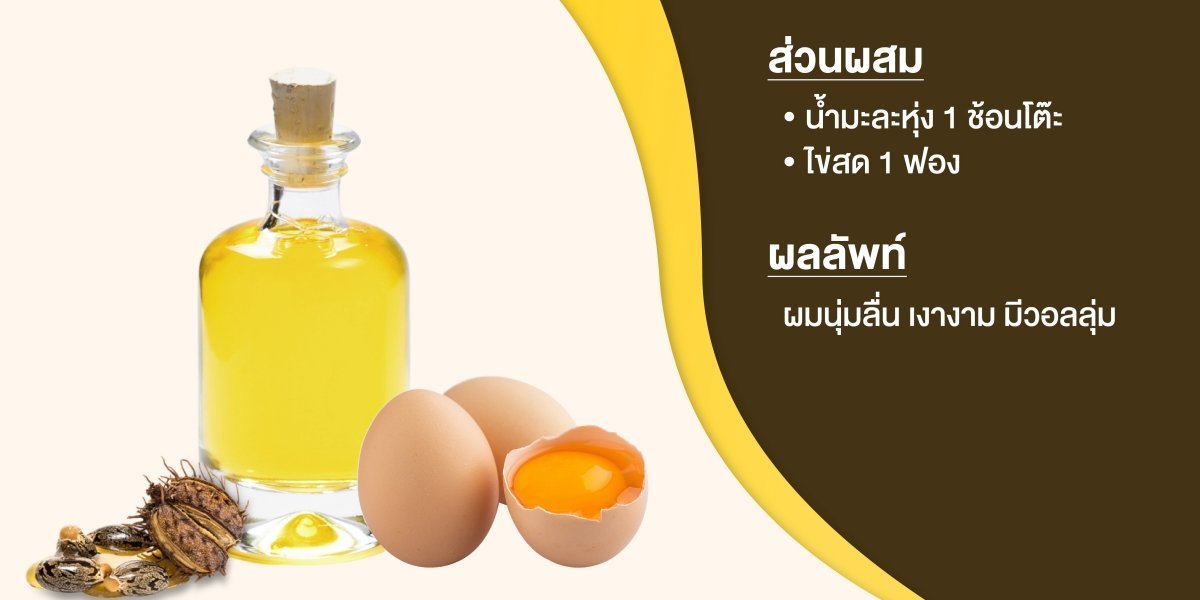 หากคุณกำลังกังวลเกี่ยวกับผมเสีย ผมร่วง น้ำมันละหุ่งคือคำตอบ น้ำมันละหุ่งสามารถช่วยเพิ่มการเจริญเติบโตของเส้นผม ทำให้ผมมีวอลลุ่ม เมื่อใช้คู่กับไข่ที่มีโปรตีนสูงช่วยรักษาน้ำมันตามธรรมชาติของเส้นผม ทำให้ผมสวยเด้ง เงางามอย่างเป็นธรรมชาติ