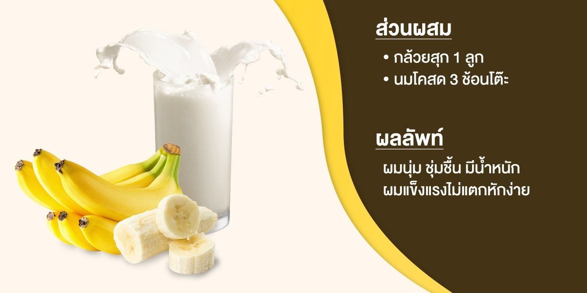 กล้วยอุดมไปด้วยวิตามิน โพแทสเซียมและน้ำมันธรรมชาติหลายชนิด ช่วยให้ความชุ่มชื้นแก่เส้นผม เส้นผมดูเงางาม เพิ่มควมยืดหยุ่น ลดการแตกหักของเส้นผมเมื่อใช้คู่กับนมจะช่วยปรับสภาพเส้นผมจากภายใน