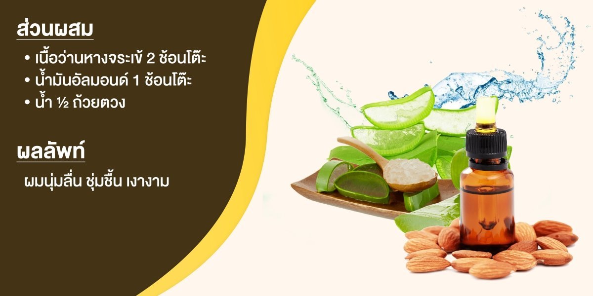 ว่านหางจระเข้คือราชาห่งสารให้ความชุ่มชื้นแก่ผิว แต่รู้หรือไม่ว่าเราสามารถนำว่านหางจระเข้มา DIY เป็นสารให้ความชุ่มชื้นแก่เส้นผมได้ด้วย เมื่อนำมาผสมกับน้ำมันอัลมอนด์ ผลลัพท์ที่ได้คือผมนุ่มลื่น ชุ่มชื้น เงางาม มีมิติ