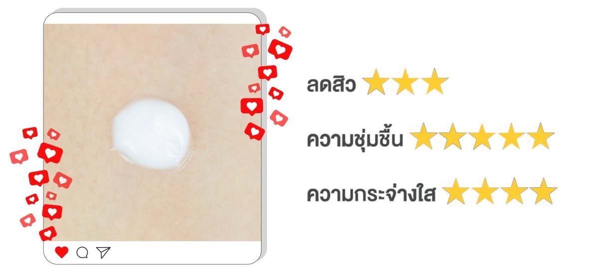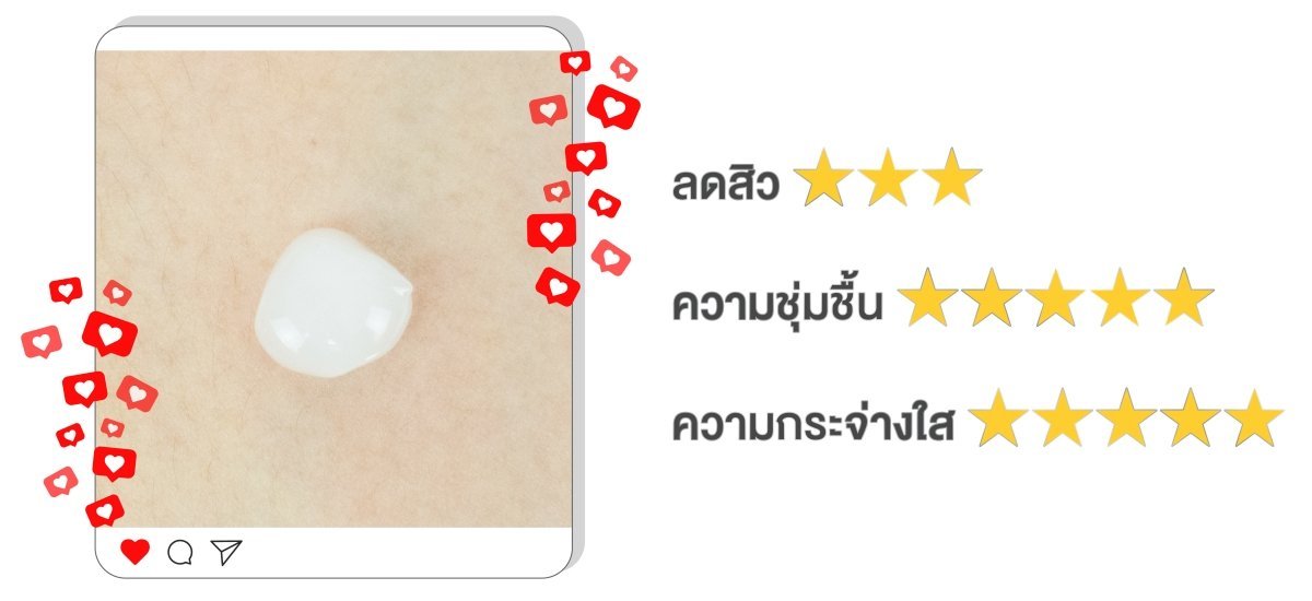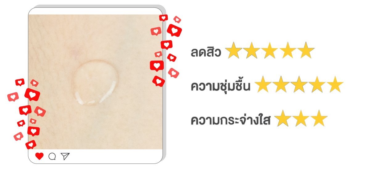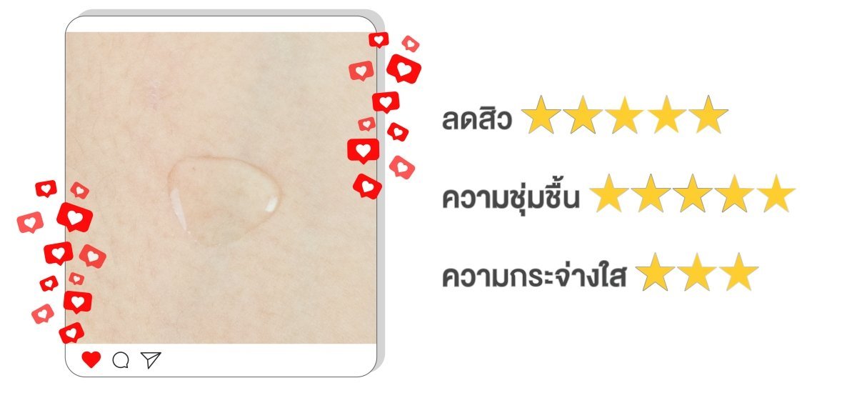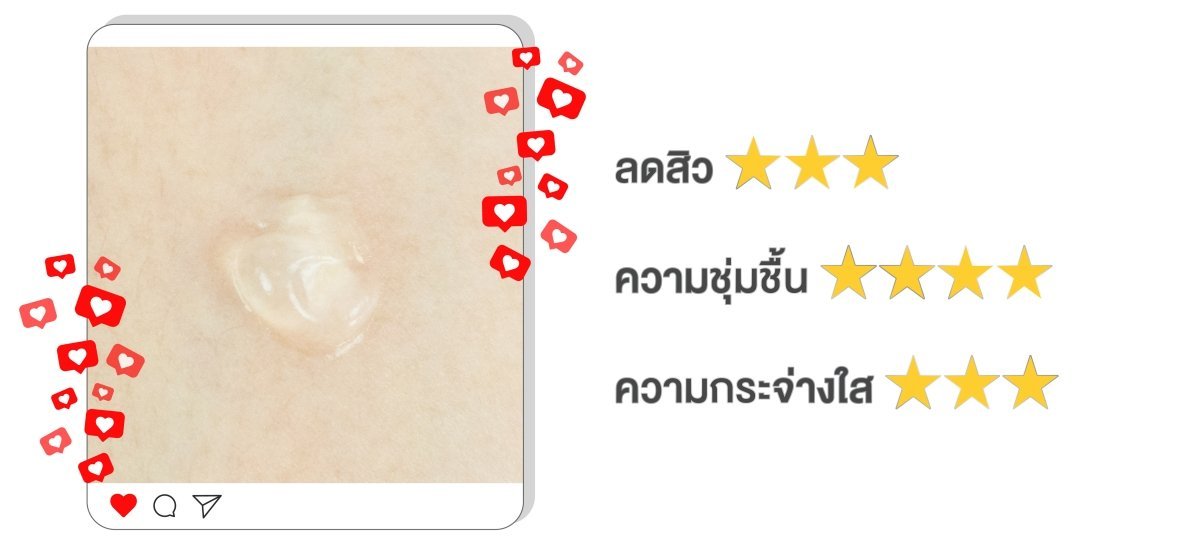 เนื้อเบสเป็นเบสน้ำ สารขึ้นเนื้อเซรั่มได้จากธรรมชาติ ให้เนื้อเซรั่มสัมผัสนุ่มลื่น อ่อนโยนต่อผิว ผสานสารให้ความชุ่มชื้น 15% ช่วยดึงน้ำเข้าสู่ผิว เพราะผิวที่มีสิวจะตามมาด้วยปัญหาผิวแห้งบางจุด ผิวจึงต้องการความชุ่มชื้นมากกว่าปกติ ให้ผิวชุ่มชื้นโดยไม่รู้สึกเหนียวเหนอะหนะ และยังสามารถเพิ่มประสิทธิภาพการซึมผ่านของส่วนผสม เช่น กรดซาลิไซลิก เพื่อการซึมซาบและประสิทธิภาพที่ดีขึ้น