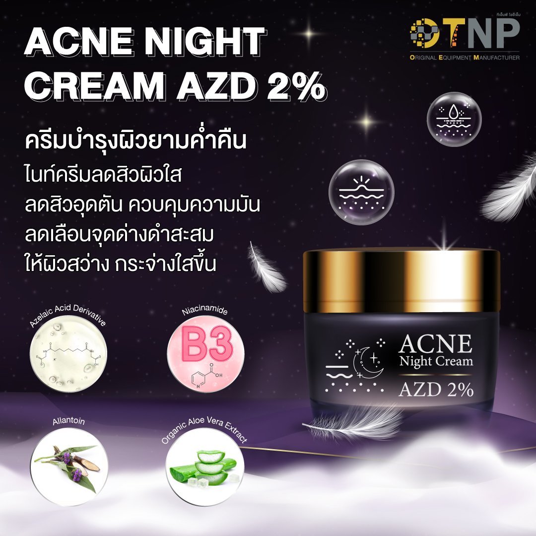 ไนท์ครีมลดสิวผิวใส จัดเต็มกับอนุพันธ์อะเซเลอิก 2% ลดสิวอุดตัน ควบคุมความมันบนผิวหน้าพร้อมลดเลือนจุดด่างดำสะสม และให้ผิวสว่าง กระจ่างใสขึ้น ช่วยเพิ่มความยืดหยุ่นให้ผิวและยังเติมเต็มความชุ่มชื้นทำให้ผิวอิ่มน้ำ ครีมให้สัมผัสนุ่มลื่น ซึมไว บางเบาสบายผิว เหมาะสำหรับทุกสภาพผิว ใช้ได้ทุกวันก่อนนอน เหมาะมากกับผิวที่มีสิวผด สิวอุดตัน ไม่มีสารที่อาจก่อให้เกิดการระคายเคืองหรืออุดตันผิว เช่น แอลกอฮอล์ ซิลิโคน น้ำหอม ซัลเฟต