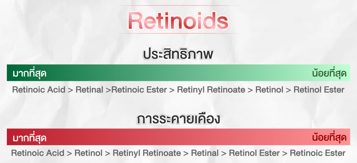 Tip: เรตินอยด์มีผลข้างเคียงคือทำให้เกิดอาการแดงและระคายเคืองได้ในบางคน สำหรับผู้เริ่มต้นใช้เรตินอยด์ แนะนำที่ความเข้มข้นต่ำก่อนแล้วค่อยๆ เพิ่มความเข้มข้นขึ้น ใช้ในช่วงกลางคืน