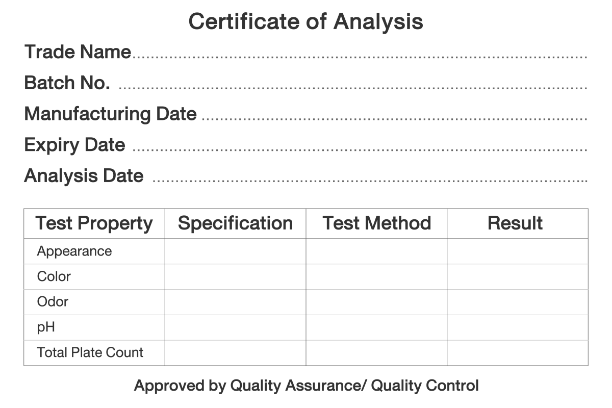 เอกสารรับรองคุณภาพของผลิตภัณฑ์ หรือใบวิเคราะห์คุณภาพของผลิตภัณฑ์ เป็นเอกสารที่ผู้ผลิตจัดทำขึ้นเพื่อยืนยันว่าผลิตภัณฑ์ที่ผลิตขึ้นนั้นตรงตามความต้องการ ในเอกสารจะแสดงข้อมูลคุณภาพและลักษณะตามหัวข้อและมาตรฐานที่กำหนดไว้ใน Product Specification โดยมีการระบุข้อมูลและตัวเลขจากการตรวจสอบและทดสอบจากห้องปฏิบัติการ พร้อมทั้งระบุถึงมาตรฐานในการตรวจสอบและทดสอบในแต่ละหัวข้อ หัวข้อที่ต้องทดสอบ เช่น ลักษณะ กลิ่น สี ค่าความเป็นกรดด่าง และมีการบันทึกข้อมูลสำคัญ เช่น หมายเลขที่ผลิต วันที่ผลิต วันที่หมดอายุ วันที่ทำการทดสอบ ส่วนสุดท้ายของ COA จะมีลายเซ็นของ QA หรือ QC ที่ระบุว่าข้อมูลที่แสดงได้รับการตรวจสอบโดยผู้ตรวจสอบที่มีคุณสมบัติและได้รับอนุญาต