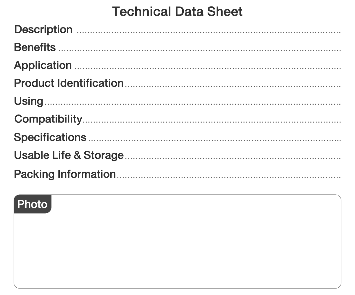 เอกสารที่แสดงข้อมูลเกี่ยวกับสาร เช่น ส่วนประกอบของสาร วิธีการใช้ ข้อกำหนดในการปฏิบัติงาน การใช้งานทั่วไป คำเตือน ทางผู้ผลิตสารได้จัดทำขึ้นมาเพื่อให้ข้อมูลกับทางนักวิจัยและเพื่อการโฆษณา ในเอกสารจะมีเทคนิคการใช้งานสารที่ถูกต้อง ปริมาณสารที่ควรใช้ในแต่ละสูตรตำรับ ความเข้ากันกับสารตัวอื่นๆ รวมไปถึงข้อความที่ใช้ในการเคลมสรรพคุณของสาร ซึ่งเอกสารตัวนี้ไม่ได้มีความจำเป็นในการทำระบบมาตรฐาน แต่สำคัญสำหรับนักวิจัยที่ทดลองและพัฒนาสูตรเครื่องสำอาง