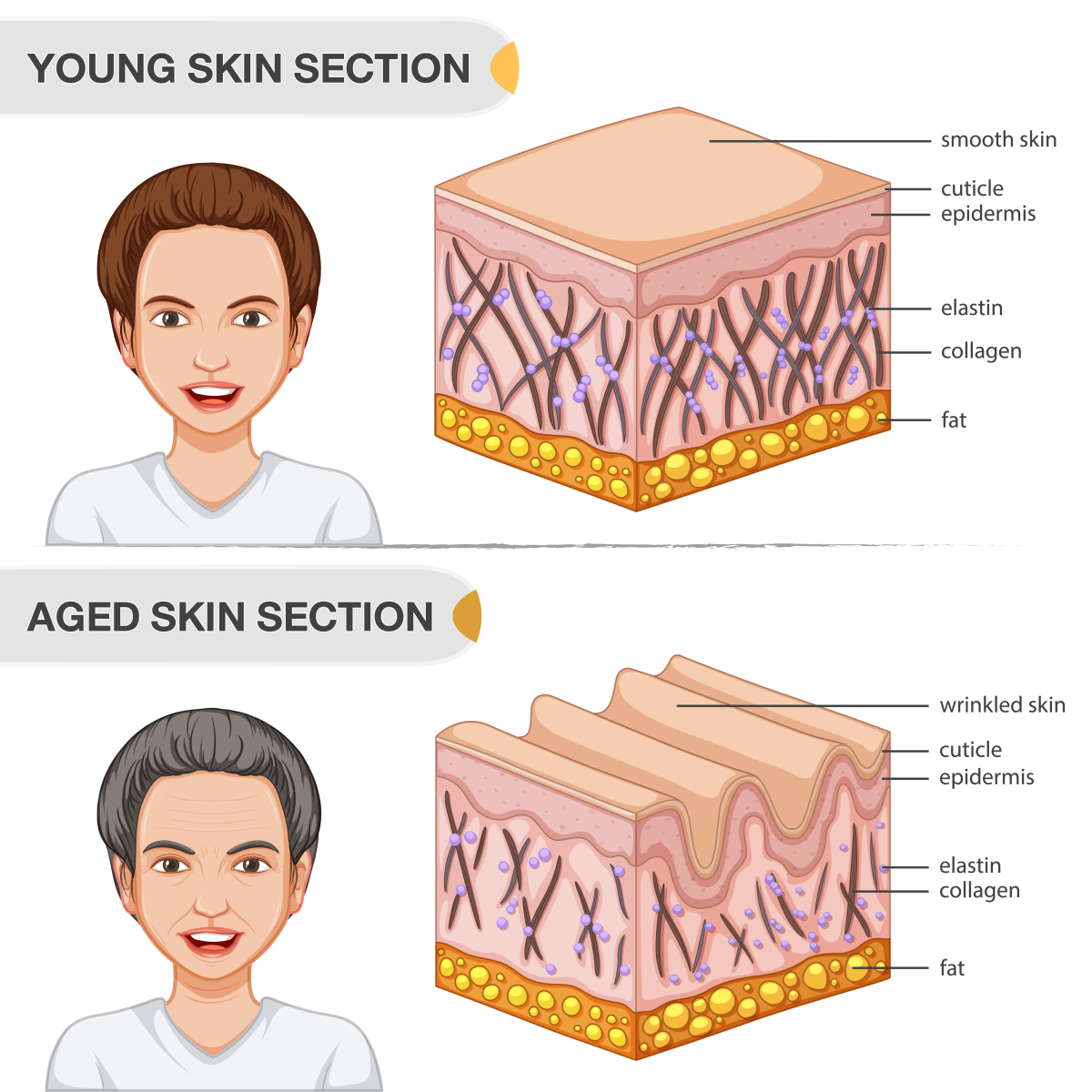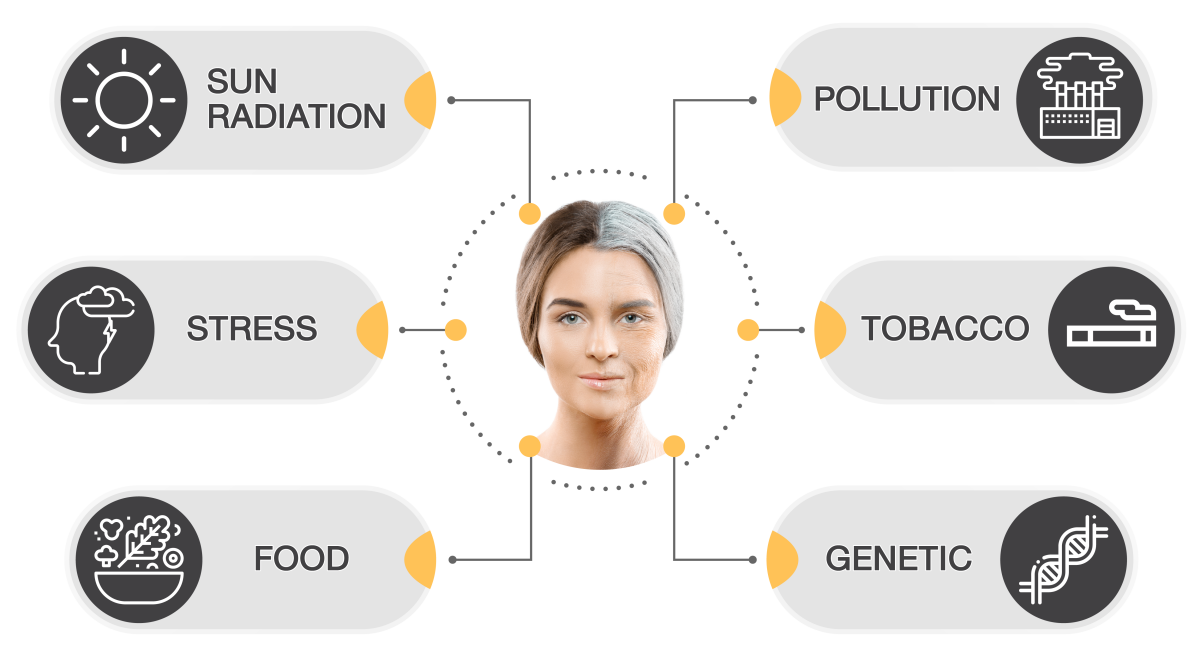 ผิวเสื่อมสภาพหรือผิวชรานั้นจะมีความยืดหยุ่นน้อยลง หยาบกร้าน สีผิวไม่สม่ำเสมอ และมีริ้วรอย โดยเกิดจาก 2 ปัจจัย ได้แก่