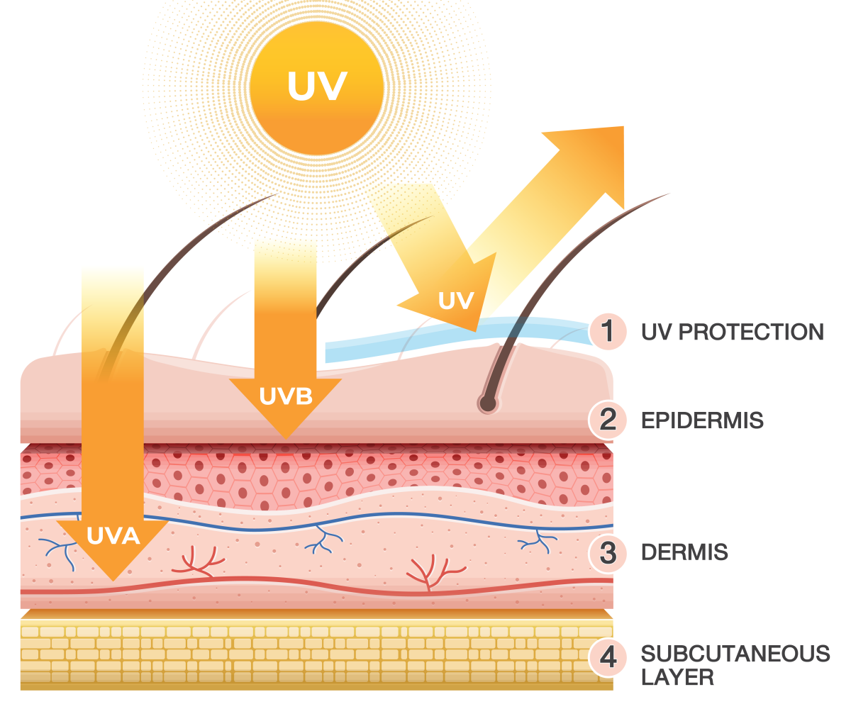 1. UVA ความยาวคลื่น 300-400 นาโนเมตร แบ่งเป็น UVA-I และ UVA-II แทรกซึมเข้าสู่ผิวได้ลึกกว่า UVB ทำลายสุขภาพผิวในระยะยาว