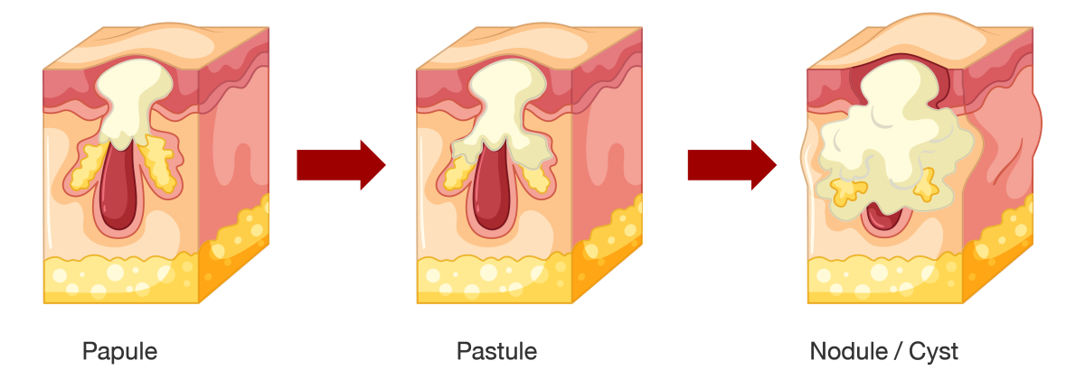 ซึ่งดูจากชนิดของสิว ได้แก่ ตุ่มนูน (Papules), ตุ่มหนอง (Pustules), และตุ่มก้อน (Nodules)