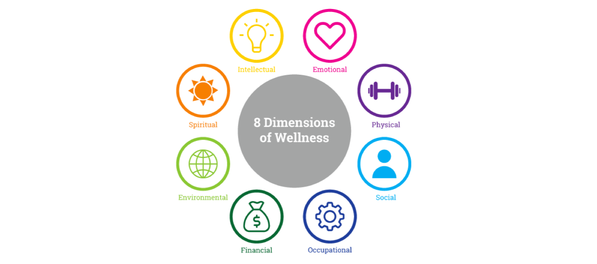 "Wellness" หมายถึง ความสุขสมบูรณ์ของบุคคลในองค์รวม ในปัจจุบันมิติของความเป็นอยู่ที่ดีมีทั้งหมด 8 มิติ นั่นก็คือ กาย, จิต, สังคม, อารมณ์, สติปัญญา, อาชีพการงาน, สภาพการเงิน และสภาพแวดล้อม