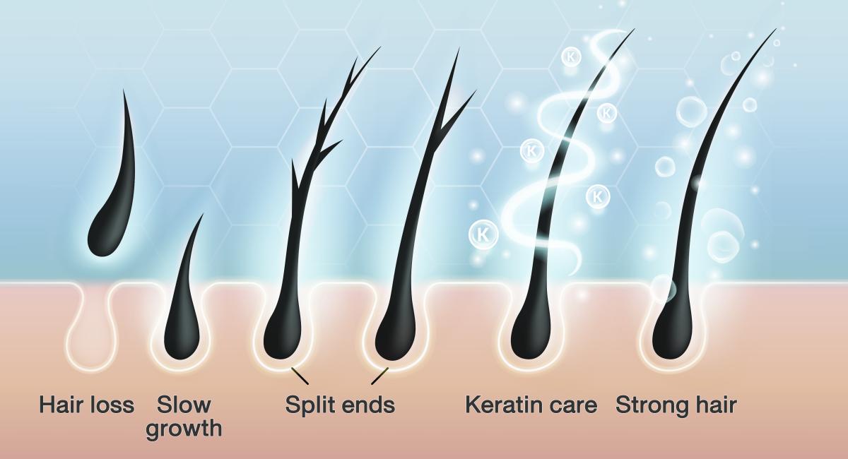 - การที่จะมีเส้นใยผมที่แข็งแรง ก็ต้องมีหนังศีรษะที่แข็งแรงด้วยเช่นกัน หากผิวหนังได้รับความเสียหายจนอ่อนแอลงจะส่งผลต่อความแข็งแรงของเส้นผม อาจทำให้ผมเกิดแตกปลายและขาดได้ง่าย