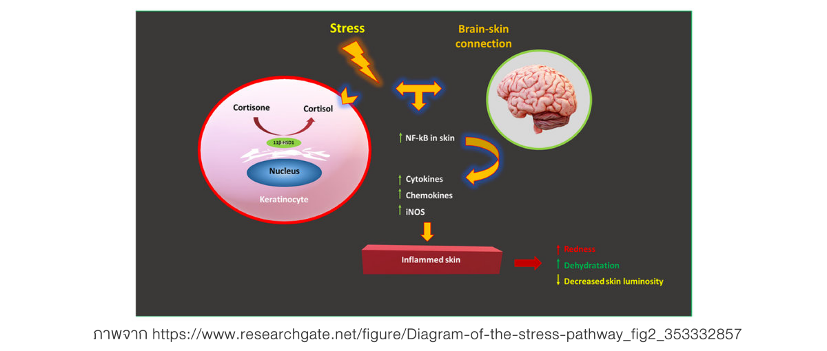 ก่อนที่จะเกิดฮอร์โมนความเครียดนั้น จุดเริ่มต้นมาจากผิวรับสิ่งอันตรายเข้ามาข้างในเซลล์ เซลล์ผิวที่มีเอนไซม์ชื่อว่า 11β-hydroxysteroid dehydrogenase type 1 (11β-HSD1) จะไปเปลี่ยนคอร์ติโซน (cortisone) ที่ไม่ทำงานให้กลายเป็นคอร์ติซอลที่พร้อมทำงานตามภาพด้านบน ภายใต้สภาะความเครียดที่เกิดขึ้นนี้ สารสื่อกลางการอักเสบในกระบวนการอักเสบ เช่น