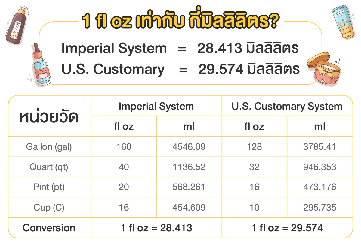 ถึงตรงนี้คงจะเข้าใจและแยกความแตกต่างระหว่าง oz และ fl oz กันได้แล้วนะคะ oz ใช้กับเครื่องสำอางที่เป็นของแข็งหรือกึ่งแข็ง ไหลไม่ได้ ส่วน fl oz ใช้กับเครื่องสำอางที่เป็นของเหลวไหลได้เท่านั้น และปริมาณที่นิยมใช้คือ U.S. Customary System ที่เห็นได้บ่อย ๆ ทั้งสินค้าในไทยและต่างประเทศ