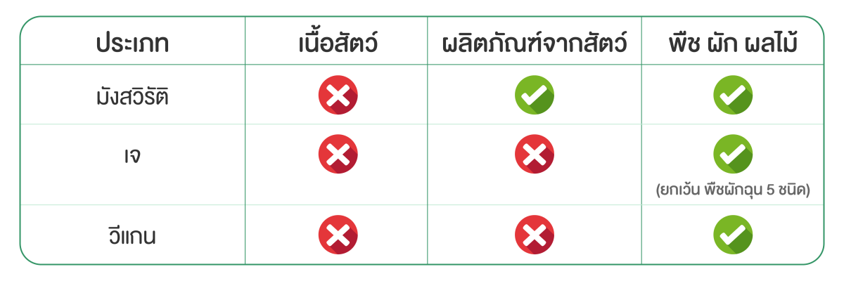 มังสวิรัติ (Vegetarian) งดเว้นเนื้อสัตว์และผลิตภัณฑ์จากสัตว์ ยกเว้นผลิตภัณฑ์จากสัตว์บางอย่าง เช่น นม ไข่ เนย ชีส น้ำผึ้ง เจลาติน เป็นต้น