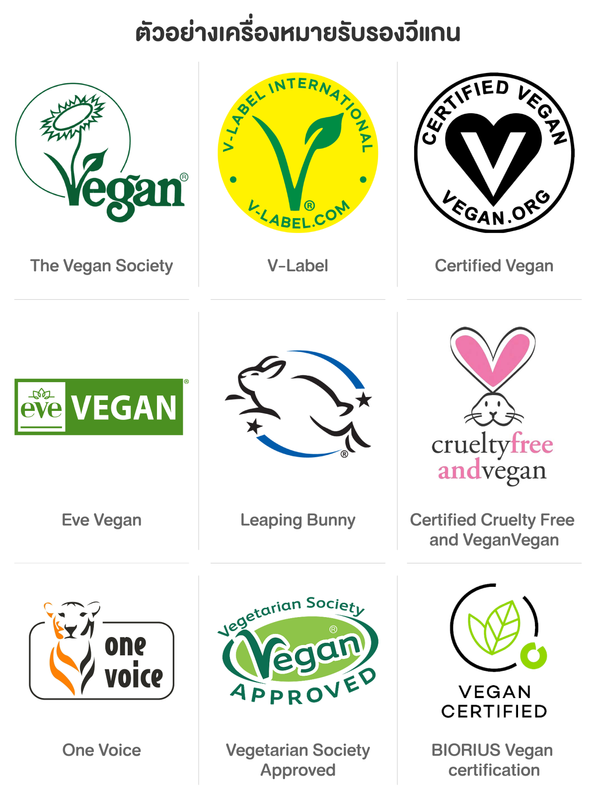1. ปราศจากส่วนผสมที่มาจากสัตว์ทั้งทางตรงและทางอ้อม โดยมีเครื่องหมายรับรอง เช่น vegan, no animal ingredients เป็นต้น
