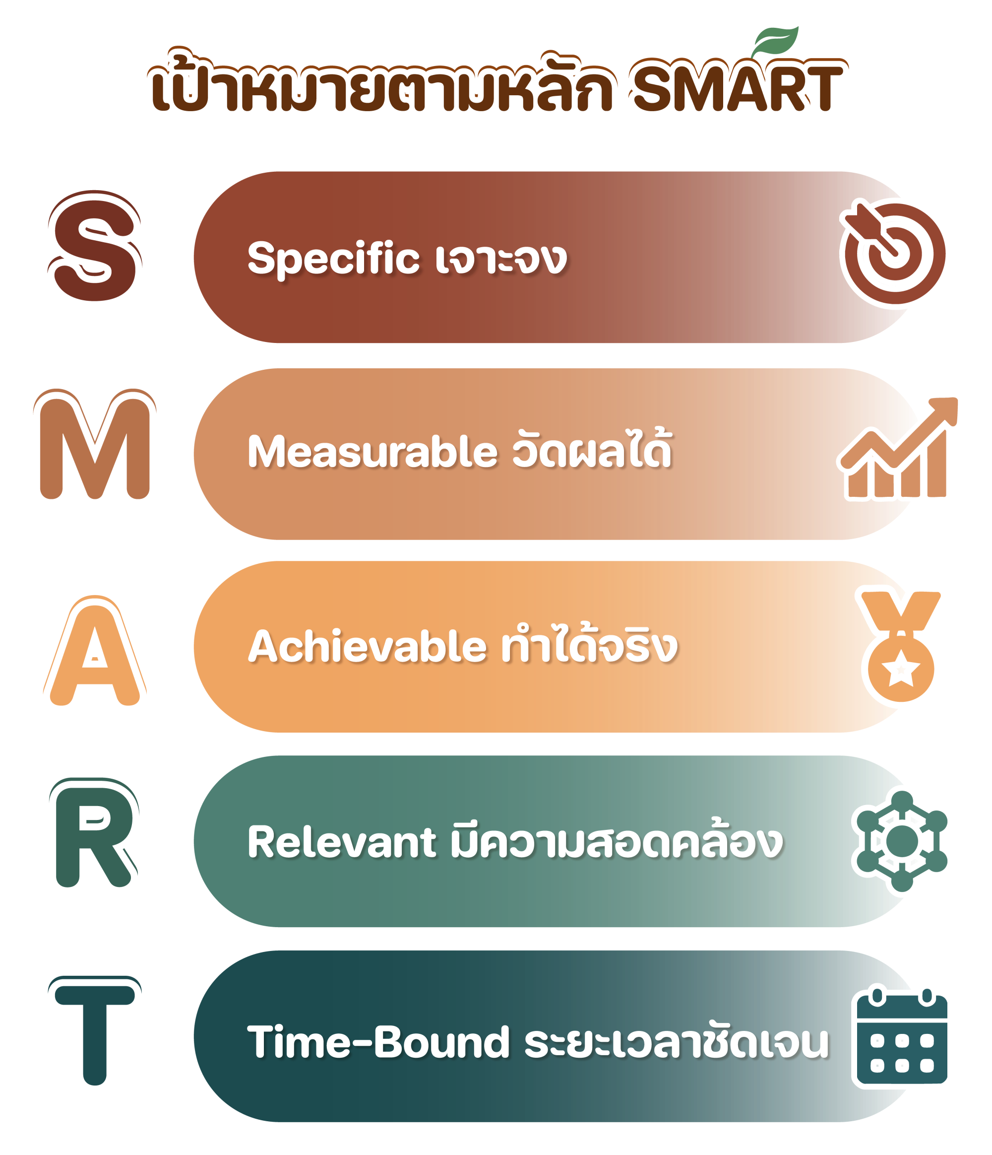 T - Time-bound เป้าหมายของคุณควรมีวันเริ่มต้นและวันสิ้นสุด กรอบเวลานี้จะช่วยให้คุณบรรลุเป้าหมายได้ภายในกำหนดเวลาที่เจาะจง และสามารถติดตามความคืบหน้าตลอดกระบวนการได้