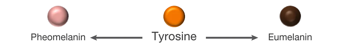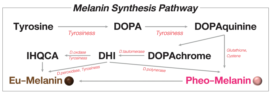 ในระหว่างการผลิตเม็ดสีเมลานิน เอ็นไซม์ไทรโรซิเนส จะผลิตสารต้นแบบ ไทรโรซิน และเปลี่ยนไปเป็นสารที่ชื่อว่า โดปาควิโนน จากนั้นขึ้นอยู่กับว่า โดปาควิโนน จะถูกกระตุ้นด้วยเอ็นไซม์ใด เพราะเอ็นไซม์แต่ละชนิดจะส่งผลถึงการผลิต ยูเมลานินหรือฟีโอเมลานินในที่สุด ซึ่งในขั้นตอนนี้ เราสามารถเพิ่มการผลิตเอ็นไซม์ที่ช่วยกระตุ้นการสร้างฟีโอเมลานินได้มากขึ้น เพื่อส่งผลให้การสร้างยูเมลานิน (สีเข้ม) ลดน้อยลง