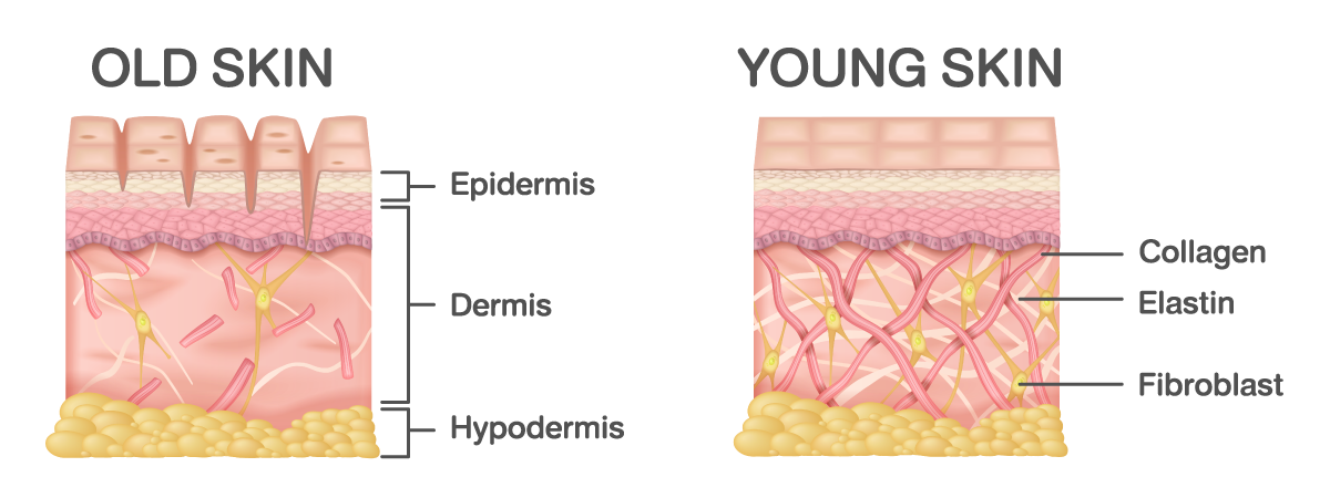 หากเส้นใยเหล่านี้ได้รับความเสียหาย เช่น จากอายุที่มากขึ้น ผิวหนังจะหย่อนยาน ผิวบาง และมีริ้วรอย
