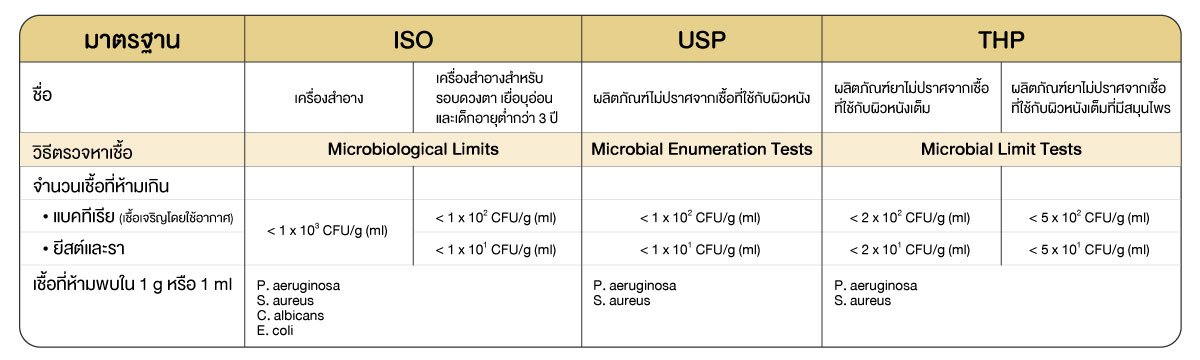 มาตรฐาน ISO ฉบับล่าสุดที่ใช้กับเครื่องสำอางตอนนี้คือ ISO 17516: 2014 เรียกวิธีตรวจหาปริมาณเชื้อจุลินทรีย์ว่า "Microbiological Limits"