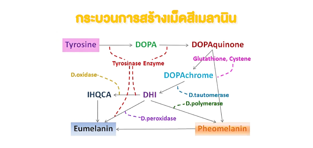 1. eumelanin ได้แก่ เม็ดสีดำ พบในคนเอเชียและคนที่ผิวคล้ำ คนผิวขาวจะมีเม็ดสีชนิดนี้น้อยกว่ามาก