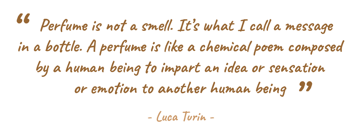 Luca Turin กล่าวว่า น้ำหอมไม่ใช่แค่กลิ่น นี่คือสิ่งที่ฉันเรียกว่าข้อความในขวด น้ำหอมเปรียบเสมือนบทกวีทางเคมีที่แต่งขึ้นโดยมนุษย์เพื่อถ่ายทอดความคิด ความรู้สึก หรืออารมณ์ให้กับมนุษย์อีกคนหนึ่ง