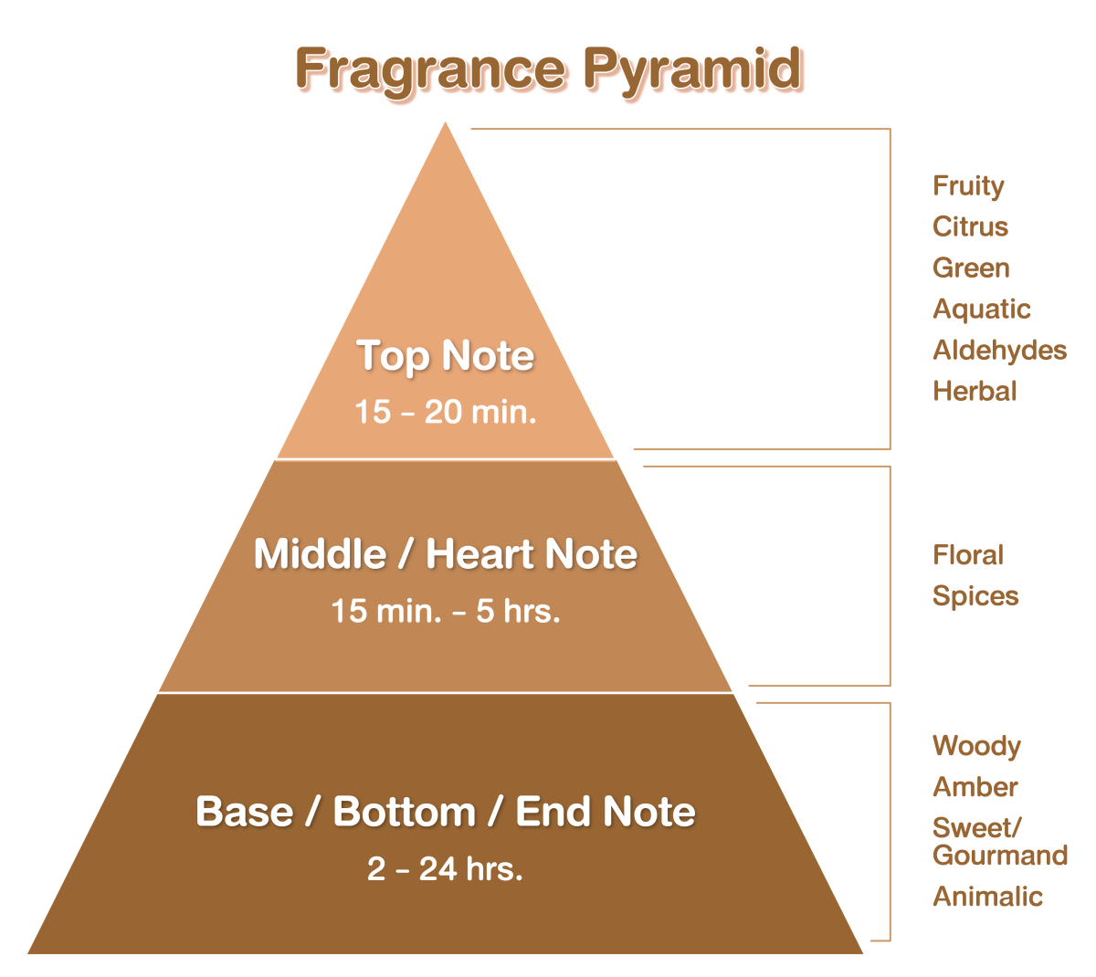 โน้ตของฟราแกรนซ์มีขึ้นเพื่อใช้อธิบายน้ำหอมในรูปแบบ โครงสร้างพีระมิด (Fragrance Pyrymid) โดยมีการใช้คำศัพท์ Top note, Middle note และ Base note น้ำหอม 2 กลิ่นแรกที่เป็นผู้ริเริ่มวิธีนี้ คือ น้ำหอม Fougere Royale และ น้ำหอม Jicky ซึ่งได้รับความนิยมอย่างมาก