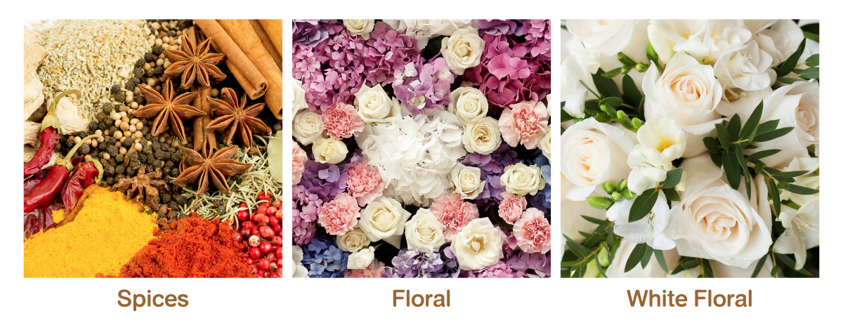 ดอก (Flower) ได้แก่ ลาเวนเดอร์ คาร์เนชัน คาโมมายล์ การ์เดเนีย ไฮยาซินท์ มะลิ จำปี จำปา กุหลาบ กระดังงา